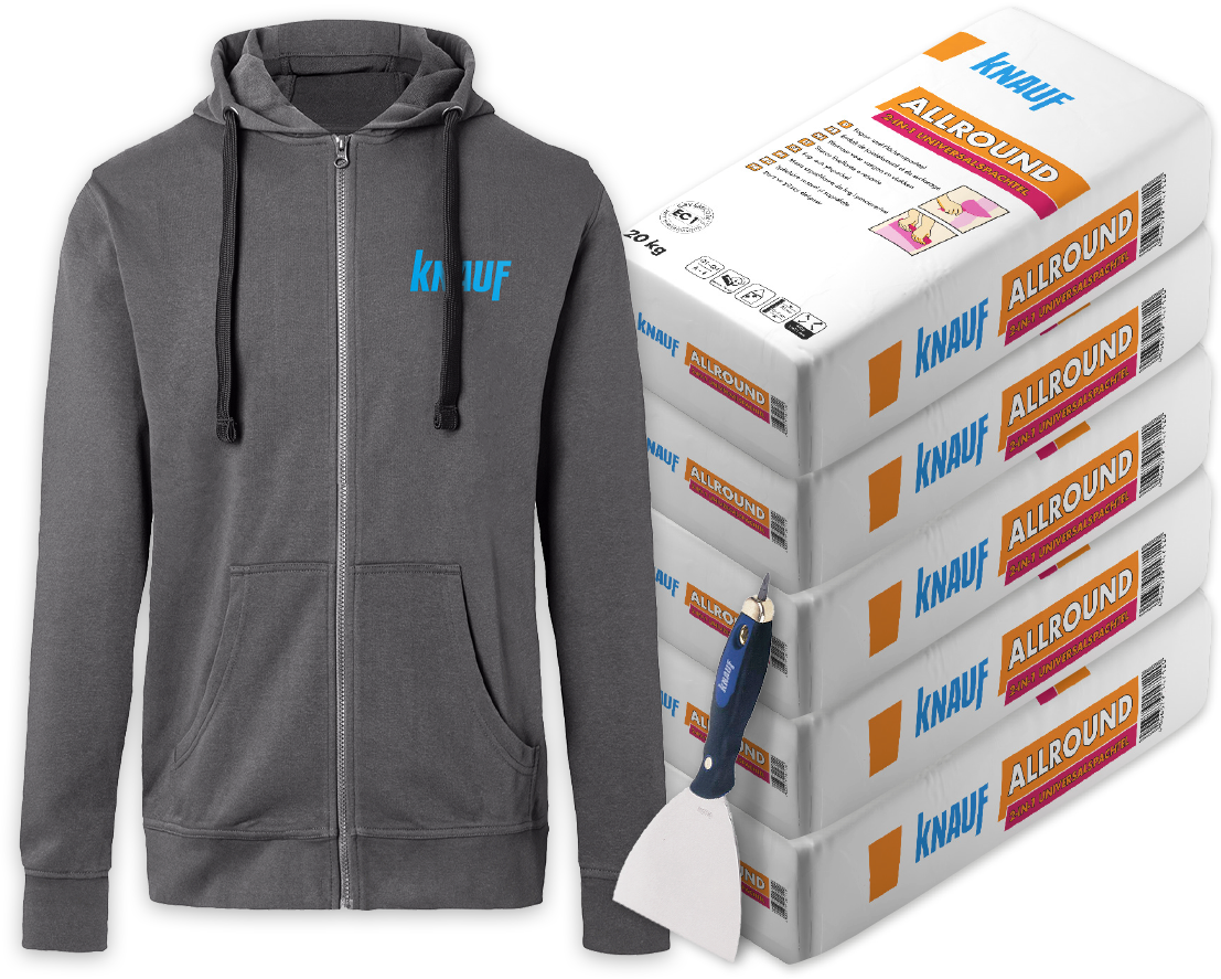 Cette promotion est ouverte à tous les clients de Hornbach. La date du ticket de caisse doit se situer dans la période promotionnelle du 04/05/2026 au 14/06/2026. À partir de cinq sacs de mastic universel Knauf Allround 2-en-1, vous recevrez une veste de travail Kübler ainsi qu'une spatule à poignée vissée Knauf. Participation réservée aux personnes âgées de 18 ans et plus. Pas de paiement en espèces. Pas d'échange. Les primes seront envoyées en deux envois distincts. Pour plus de détails, consultez les